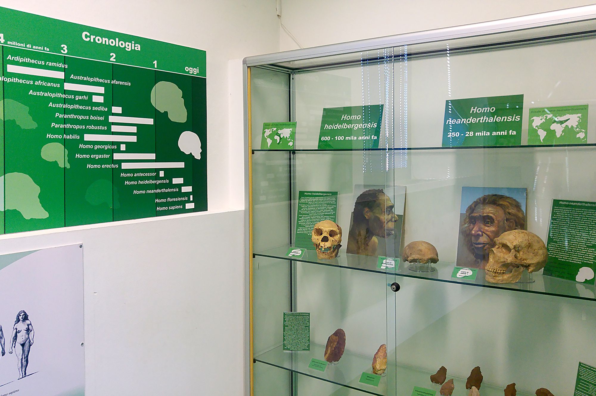 Una collezione di calchi di famosi reperti, aggiornata con le ultime scoperte paleoantropologiche, che consente di ripercorrere le tappe saliente dell’evoluzione umana: dall’australopiteco ad Homo sapiens, passando da specie chiave come Homo ergaster ed Homo heidelbergensis. L’esposizione si conclude con una delle più importanti raccolte di fossili umani mai rinvenuta nel fiume Po, unica collezione di paleontologia umana della Provincia di Cremona.